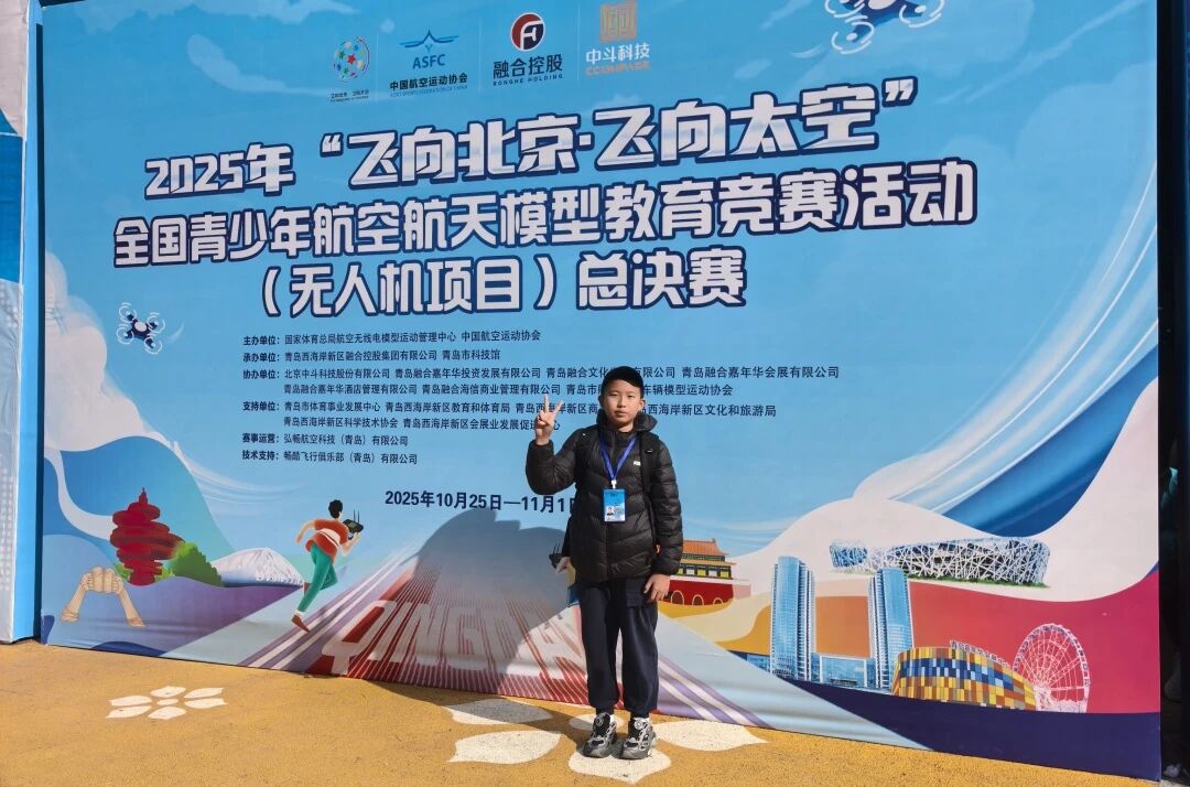 在 2025 年 「飞向北京·飞向太空」 全国青少年航空航天模型教育竞赛活动 (无人机项目) 总决赛上,1 名学生斩获小学组一等奖,此前,该学生还取得第九届全国青少年无人机大赛总决赛 「雷霆行动」 赛 (小学组) 一等奖。